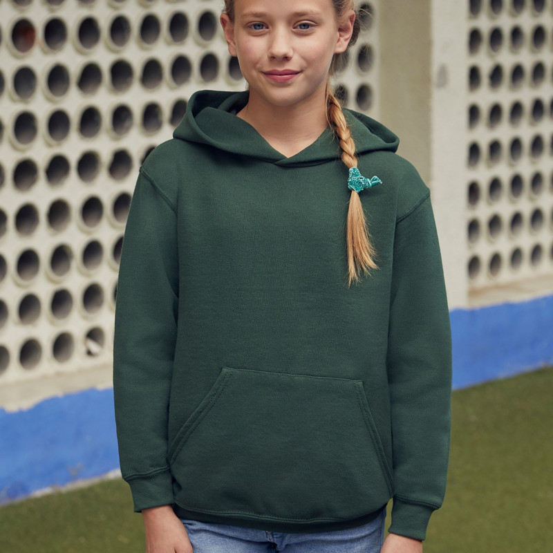 Le sweat à capuche Classic pour enfant, qui comporte une capuche double épaisseur sans cordon de serrage, conformément à la législation européenne relative aux vêtements pour enfant, se décline en une vaste gamme de couleurs et convient parfaitement aux secteurs du sport, du tourisme, de l'événementiel, etc. Il comporte une poche kangourou à l'avant et des côtes en coton/Lycra® à la taille et aux poignets, pour plus de confort.